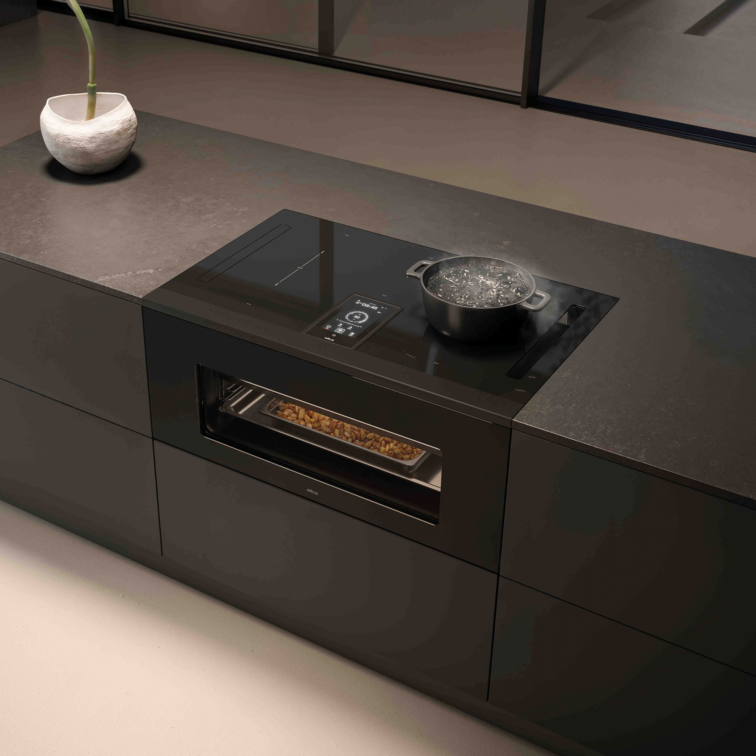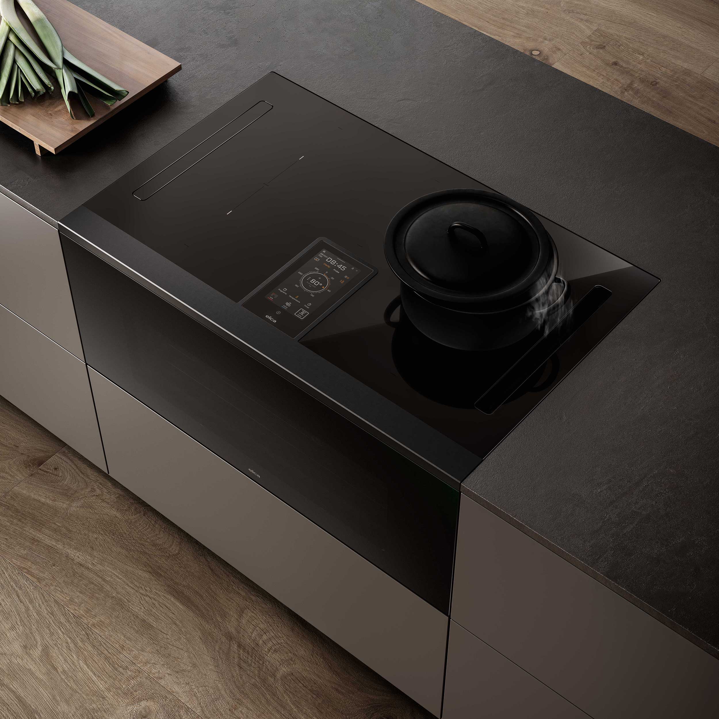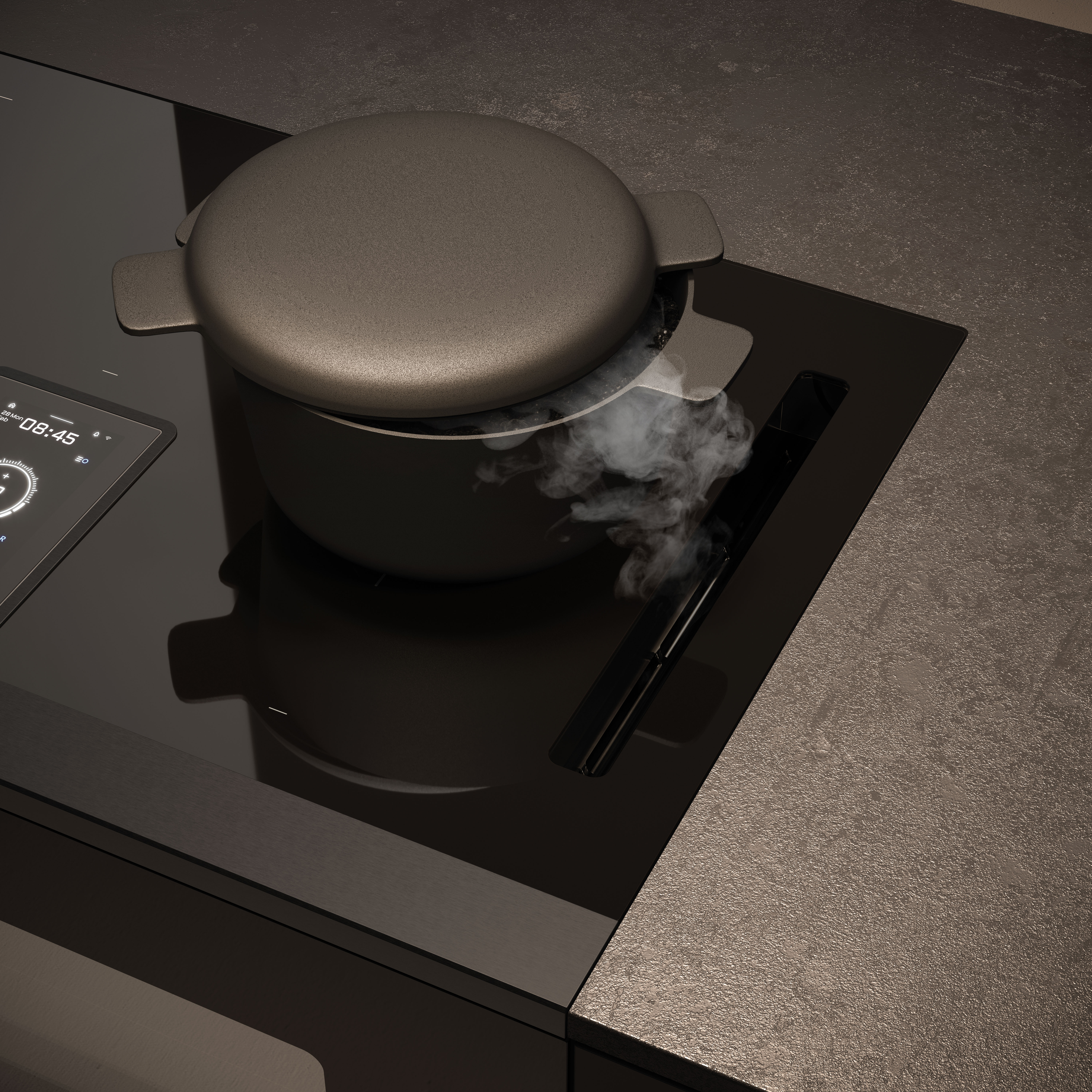 LHOV BL/A kombinerer dampovn, induksjonsplatetopp med fem soner og effektiv ventilator i én integrert enhet. Med børsteløs motor, Selective Autocapture sensorteknologi og lavt støynivå på 62 dB(A) ved maksimal effekt. Elegant svart glassdesign med håndtaksfri dør og digital TFT-touchstyring.